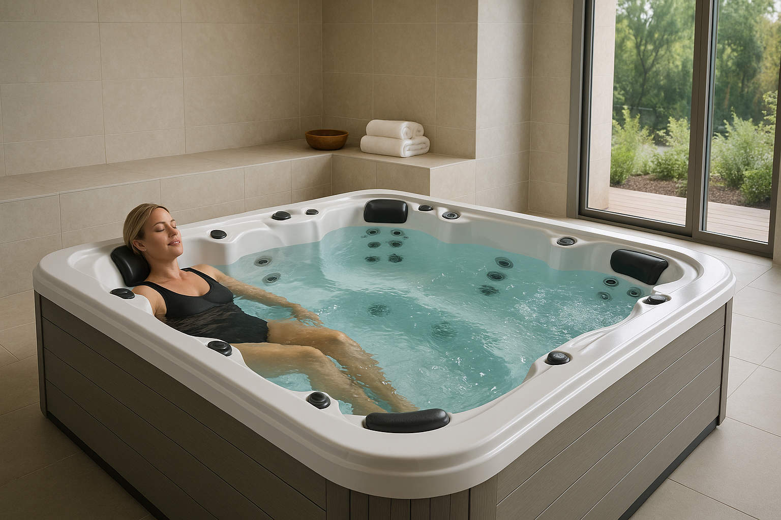 Bassin équipé de buses d'hydromassages dont l'eau est chauffée à environ 37 °. Les bulles d'air injectées sous pression provoquent des remous, et un système de chauffage et de filtration est intégré au dispositif.