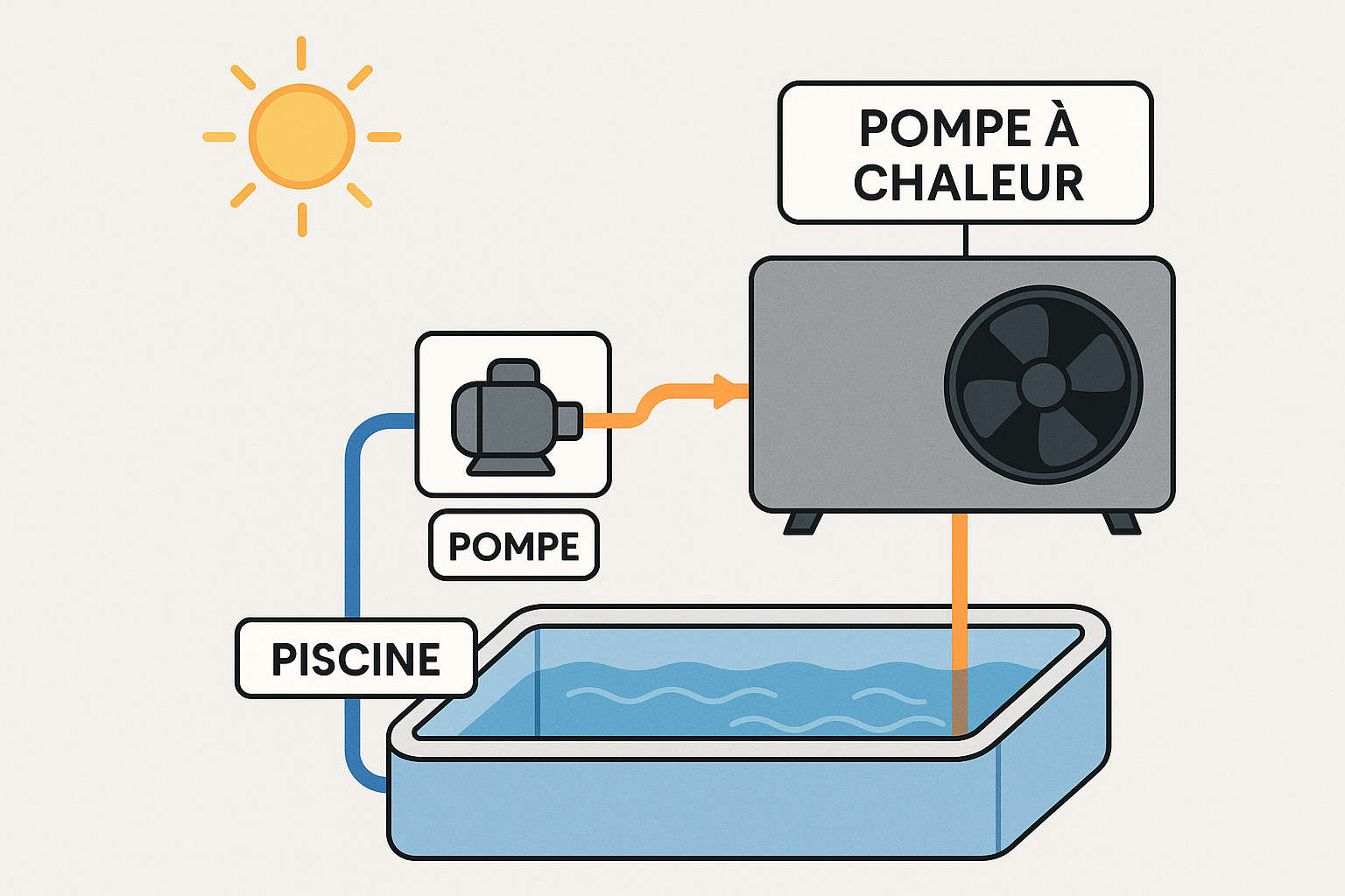 Il s’agit d’une pompe qui récupère les calories de l’air extérieur pour chauffer l’eau de la piscine via un échangeur thermique. C’est l’un des systèmes les plus répandus.