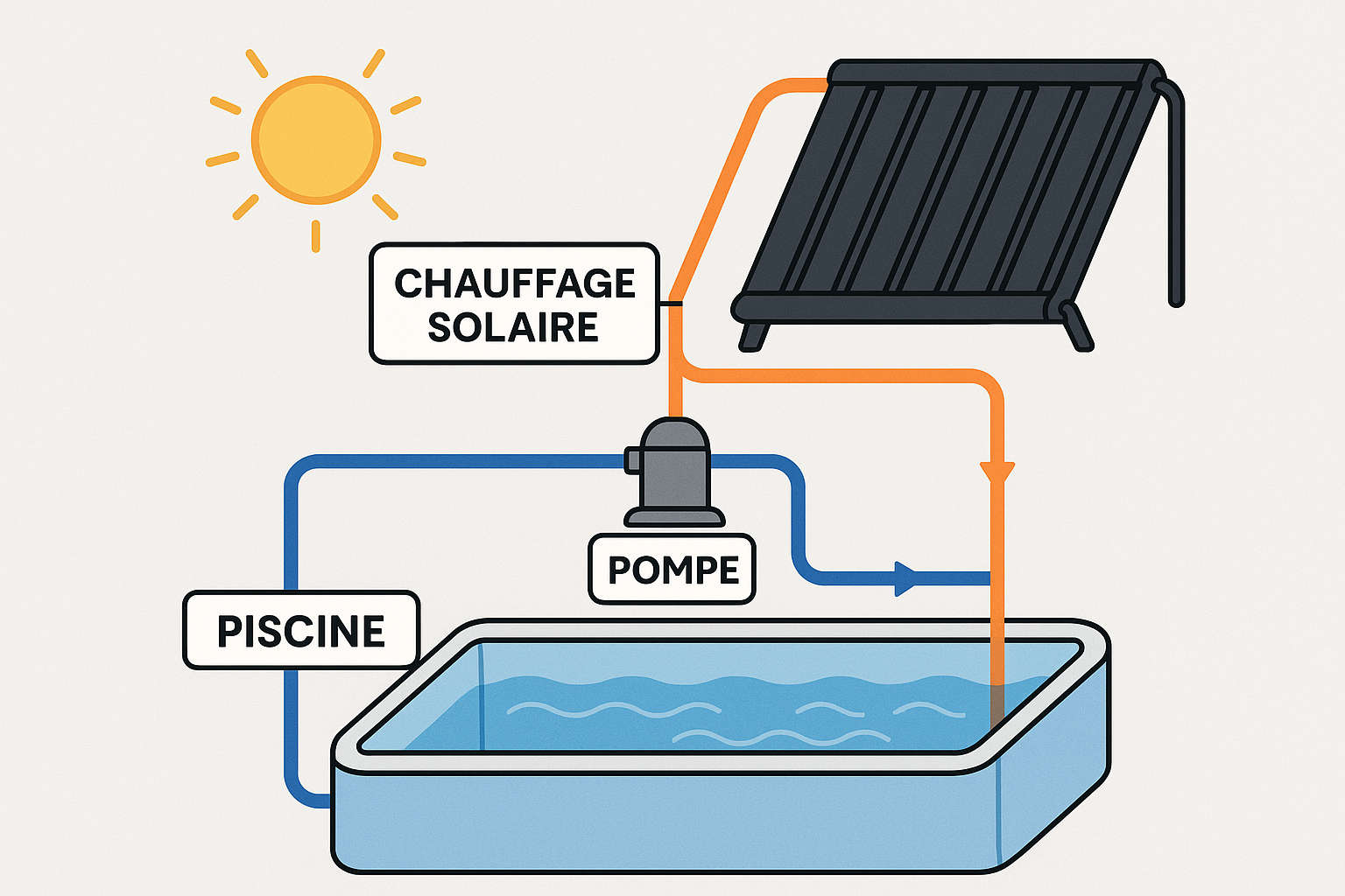 Pertinent si on habite dans une région ensoleillée et si la piscine n’est pas trop grande. L’eau passe par des capteurs solaires (souvent noirs) qui la réchauffent grâce à l’énergie solaire. On peut envisager la pause de panneaux solaires.