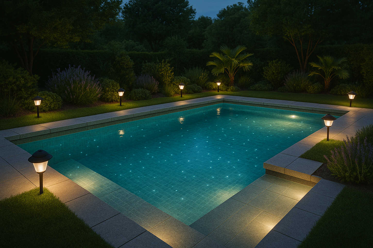 L’éclairage n’est pas seulement une question d’esthétique. Il assure la sécurité des baignades nocturnes, met en valeur l’architecture du bassin et contribue à l’ambiance générale d’un jardin (et à épater les invités lors de vos soirées d’été 😉).